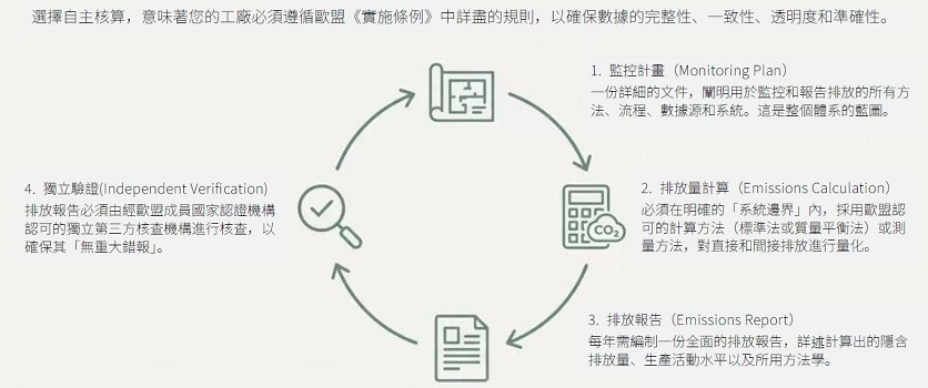 歐盟也明確要求,所有碳數據須依歐盟指定計算方法,並通過歐盟認可的第三方機構驗證機構核可,大幅提高透明度與可信度門檻。這代表「估算、概算、內部表格」已不被接受,能否通過驗證,將成為能否出口的前提條件。