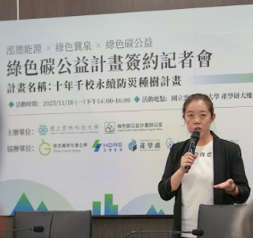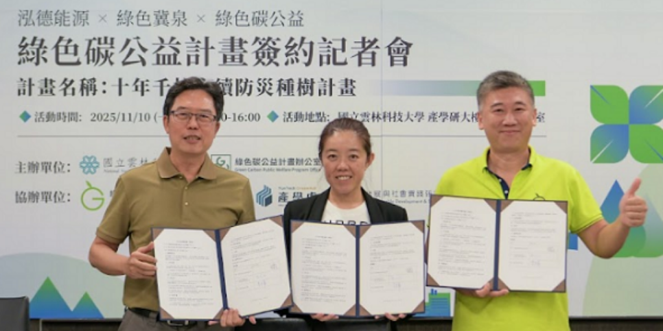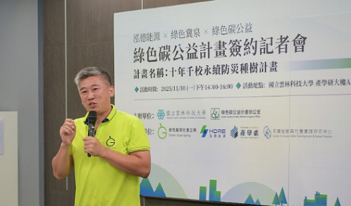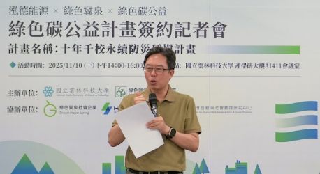 雲林科大「綠色碳公益計畫辦公室」,為響應全球淨零碳排與氣候行動目標,並推動永續教育向下扎根,在綠色冀泉社會企業創辦人陳宇華的撮合下,與泓德能源共同啟動「十年千校永續防災種樹計畫」。三方並於11月10日舉行合作簽約記者會,正式宣告這項公益活動正式啟動,共同攜手推動校園防災綠化、碳權管理與環境教育的長期行動。